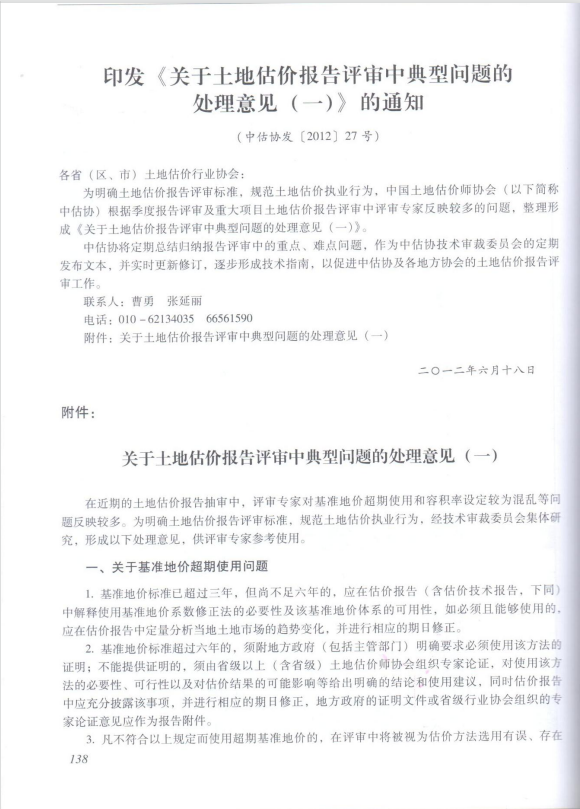 印发《关于土地估价报告评审中典型问题的处理意见(一)》的通知(中估协发【2012】27号)